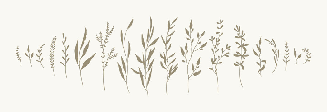 Floral branch set for logo or decoration. Silhouette wedding flowers  herb and leaves for invitation save the date card. Brush botanical trendy greenery. Vector