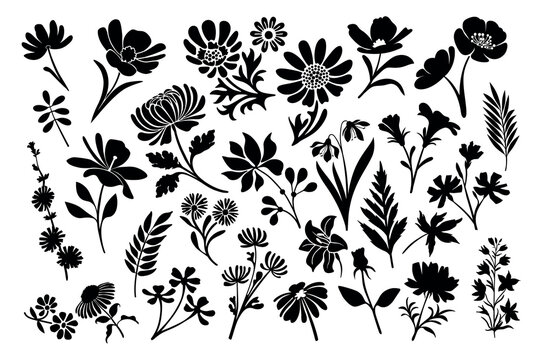 Wildflower bouquets set, floral silhouettes. Hand drawn chamomile, cosmea, poppy, lavender, and other botanical herbs and flowers for design projects. Vector illustration.