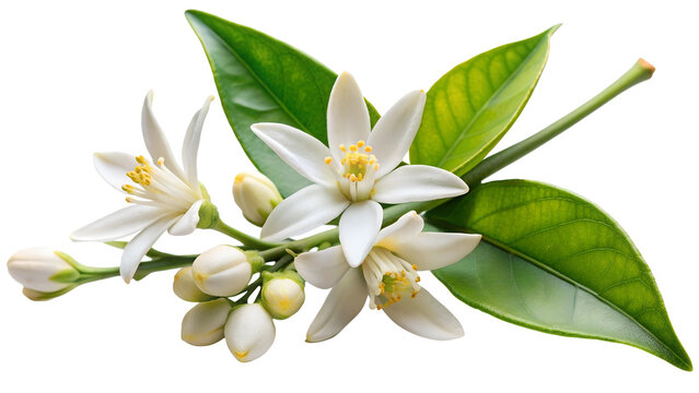 Neroli flowers. Citrus aurantium Neroli blossom on twig isolated on on white transparent background, cut out png element.
