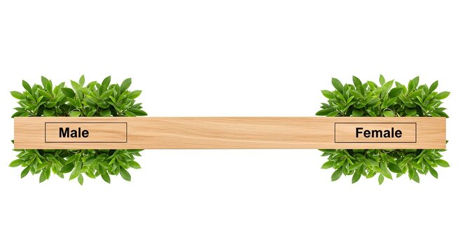 A wooden plank with 'Male' and 'Female' labels, flanked by lush green plants on both sides, symbolizing a connection or balance.