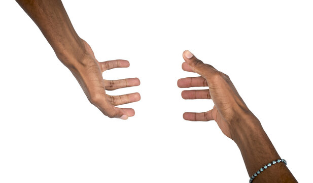 Outstretched hands reaching forward with open palms in supportive gesture. Black skin male showing