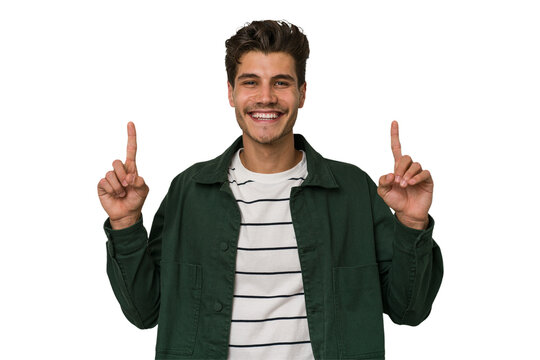 Young handsome caucasian man isolated on white background indicates with both fore fingers up showing a blank space.