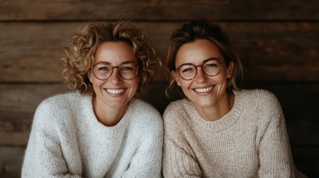 Two women, both wearing glasses and cozy sweaters, smile warmly at the camera. The image captures a moment of friendship and shared happiness in a comforting setting.