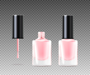 Young adult woman hand holding white brush and washing inside transparent plastic bottle on light blue table background. Pastel color. Point of view shot. Closeup. Top down view.