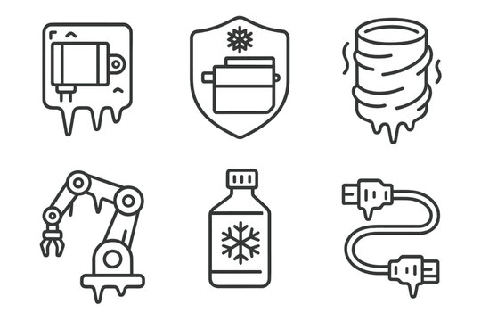 Cryo-Robotics Icons. Line style icons of cryo-robotics: frozen actuator icon, low-temp servo badge, thermal insulation shell,