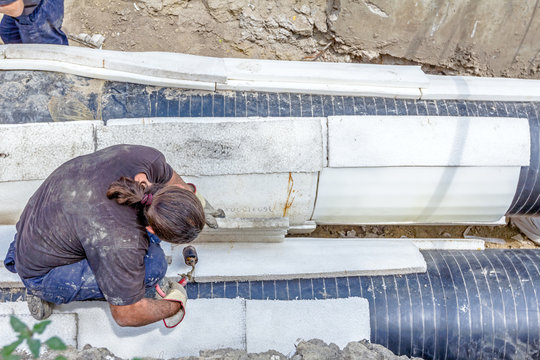 Worker is placing set of Styrofoam thermal insulation on new pipeline in trench