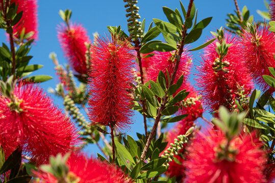 Bright red bottlebrushes flowers or callistemon plant under blue sky in afternoon summer sun.Bees on gorgeous bottlebrush flowers.