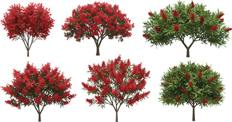 Realistic red flowering trees and bushes, bottlebrush and garden plants illustration, lush foliage clipart, vibrant nature flora collection