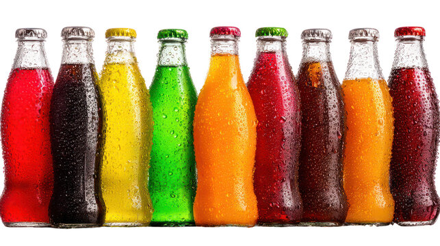 Assorted bottled cold drinks with water droplets arranged on white background