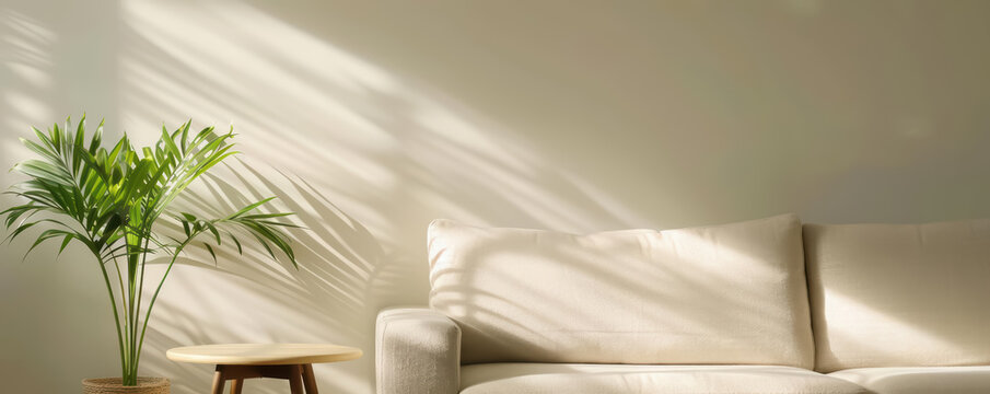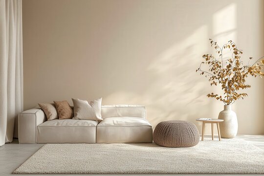 Interior beige wall in living room with copy space beige sofa side table leaf in vase pouf boucle rug