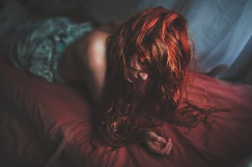 woman blurry in the background with red lacy lingerie bra in the foreground of a boudoir bedroom shoot
