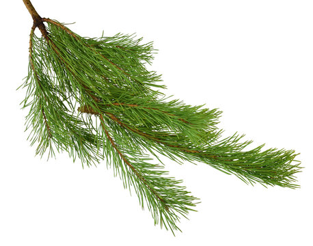 Green fir tree branch on a white background, detailed close-up. Nature and holiday decor concept