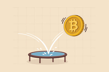 Bitcoin price rebound, crypto currency bounce back to rising up after falling down concept, golden bitcoin bounce back on the trampoline rising up on price graph.