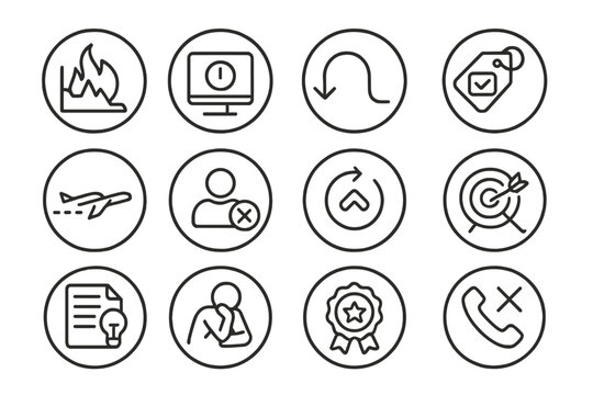 Startup Journey Icons. Line style round icons of startup failure and resilience: burn chart, shutdown icon, bounce back arrow,