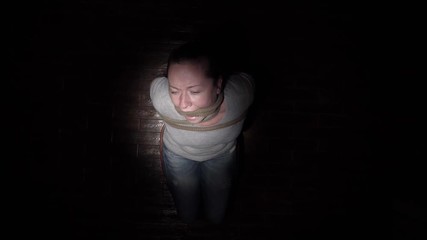 A woman sitting on the floor with her hands bound by a blue rope. Her head is bowed, and her hair falls over her face, conveying a deep sense of distress and vulnerability.