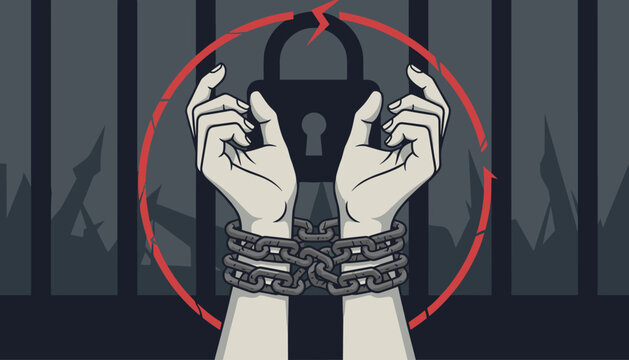Symbolic illustration of a pair of hands bound by heavy metal chains, trapped behind prison bars, with a cracked red circle and a locked padlock overhead, representing imprisonment, restriction, and