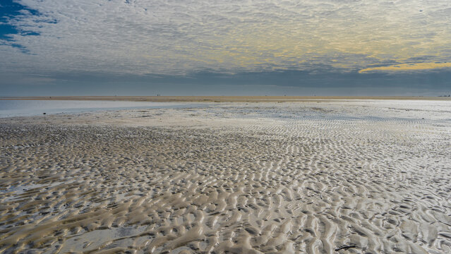 The low tide in the ocean. The wavy pattern of the sandy ridges of the exposed seabed. Puddles of water on the sand. Picturesque clouds in the blue sky. The boundless expanse. Madagascar. Morondava.