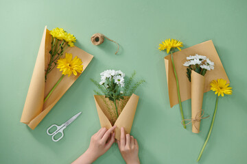 Light bedroom and pastel green and gray bedding linen set. Huge white peonies bouquet