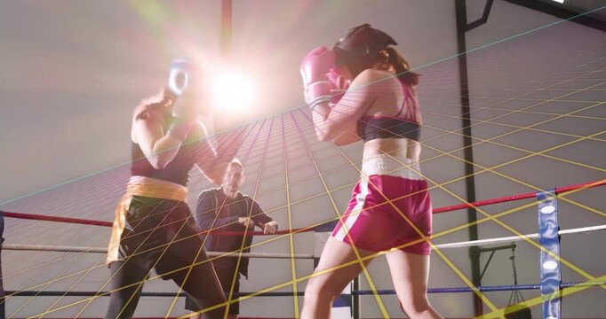 Female boxers sparring in boxing, pink-gloved boxer pressing to score, yellow-grid lensflare