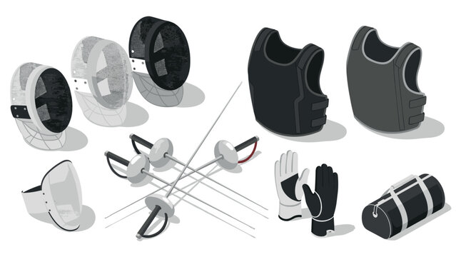 Fencing equipment set featuring masks, swords, gloves, and protective gear