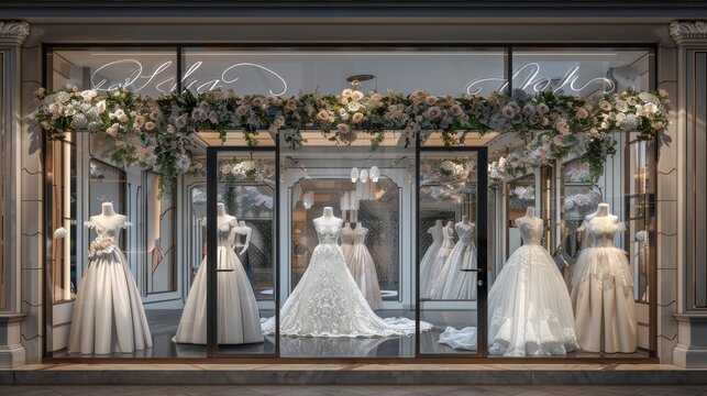 Beautiful wedding dresses, bridal dress hanging on hangers and mannequins in studio, shop. Fashion look. Interior of bridal salon. Wedding show room trendy, modern.