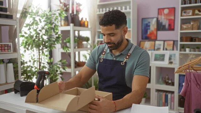 Young man working in a home decor shop packaging products at a table surrounded by indoor plants and decorative items