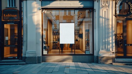 Boutique Storefront with Digital Display. An elegant boutique shop window at dusk, featuring a digital display screen for dynamic advertising amidst luxurious fashion items. Street mockup, advertising