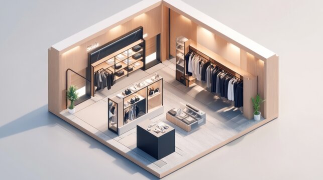 Modern Retail Store Interior with Blank Digital Display, Mannequins, and Clothing.
