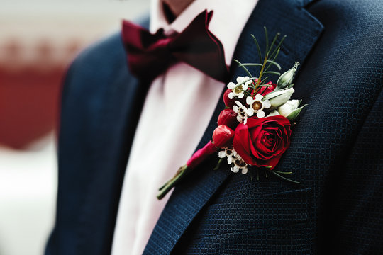 Groom's boutonniere on the jacket red red rose
