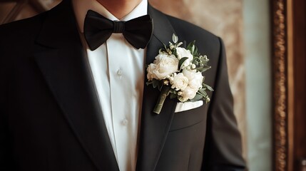 Awesome photo of groom wears black tuxedo with bow tie. Boutonniere of white flowers decorates suit. Classic male attire, wedding fashion.