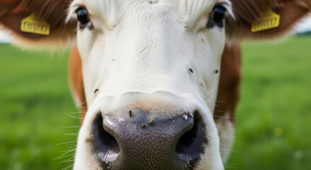 Close-up do focinho de vaca em pastagem verde com profundidade de campo rasa