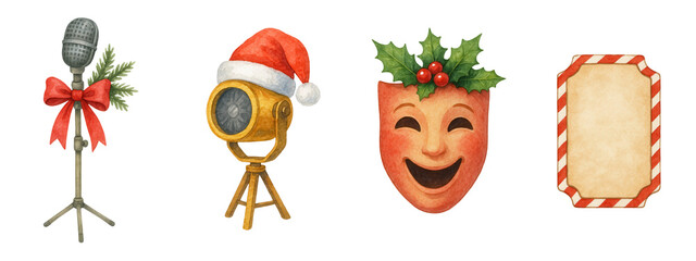 Christmas festival lifestyle hobbies watercolor vintage microphone with bow spotlight with Santa hat festive mask and blank tag