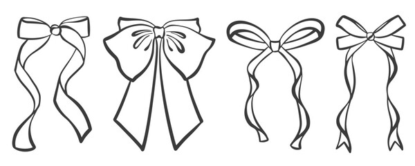 Set of whimsical hand drawn bows. Whimsy vintage line art ribbon gift. Cute coquette wedding trendy bow sketch. Vector outline illustration