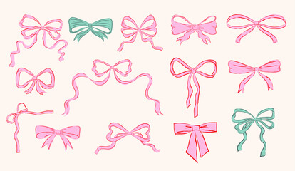Set of various bows, gift ribbons. Bowknots in hand-drawn and flat styles. Fashionable vector illustration. Hair accessory. Bow knots for gift wrapping