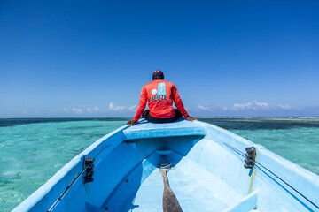 Man sits on bow of a boat, heading out to go fishing