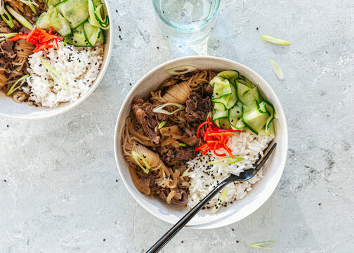 Japanese beef rice bowl with red pickled ginger