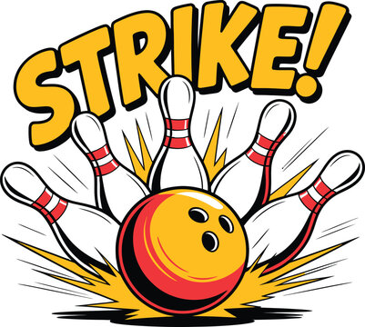 Red Bowling Ball crashing into the pins on bowling alley line. Illustration of bowling strike