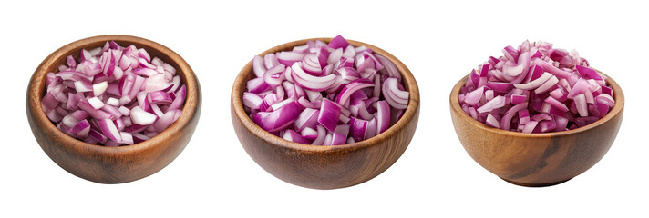 Wooden bowls filled with chopped red onions isolated on white background. Raw Red Onion Cubes in Wooden Dish Kitchen Preparation Isolated Image