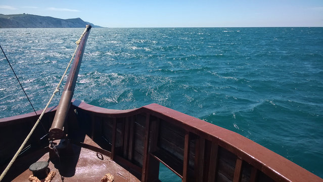 Bowsprit of an old sailing ship against ocean waters, vintage marine image, copy space, horizontal aspect