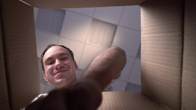 Portrait of happy Caucasian man opening carton box smiling looking at camera expressing positive emotions receiving present. Youth and happiness concept.