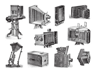 Old photo camera collection / vintage illustration from Brockhaus Konversations-Lexikon 1908