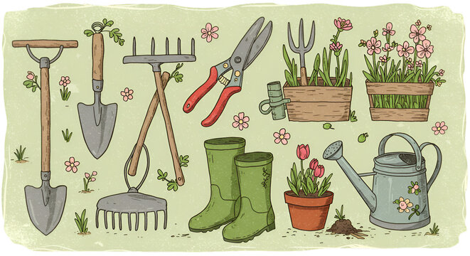 Gardening Tools Illustration With Green Background Featuring Flowers and Boots