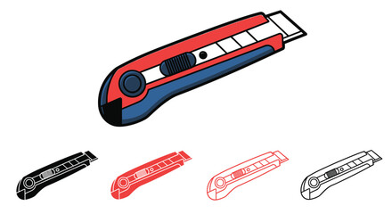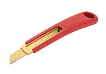 Red utility knife PNG isolated on transparent background, box cutter with retractable blade for cutting cardboard and packaging