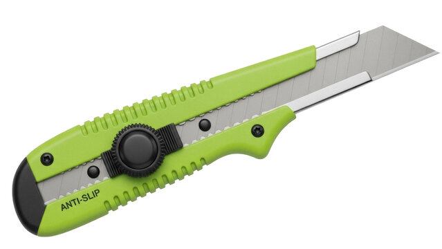 Green utility knife isolated PNG on transparent background, box cutter with retractable blade for cutting cardboard and packaging