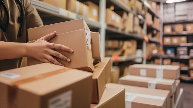 Worker organizes boxes in a spacious warehouse setting