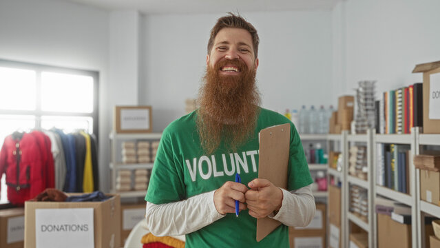 Man smiling while writing on clipboard in building surrounded by donation boxes and shelves; charity spirit.
