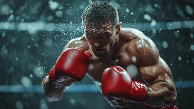 A muscular male boxer with short hair stands in a fighting stance wearing red boxing gloves and matching shorts.