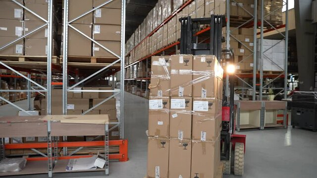 Professional forklift driver moving huge pallet of cardboard boxes while riding between rows of racks in storehouse. Male worker in hard hat driving loader with goods around warehouse