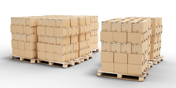 Pallets with boxes. Wooden pallets for parcels. Cardboard boxes for transpartments of goods. Parcels with stickers are isolated on white. Warehouses, logistics, transportation. 3d image