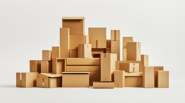 Stacked cardboard boxes in various sizes on a bright blue background for shipment or storage concepts